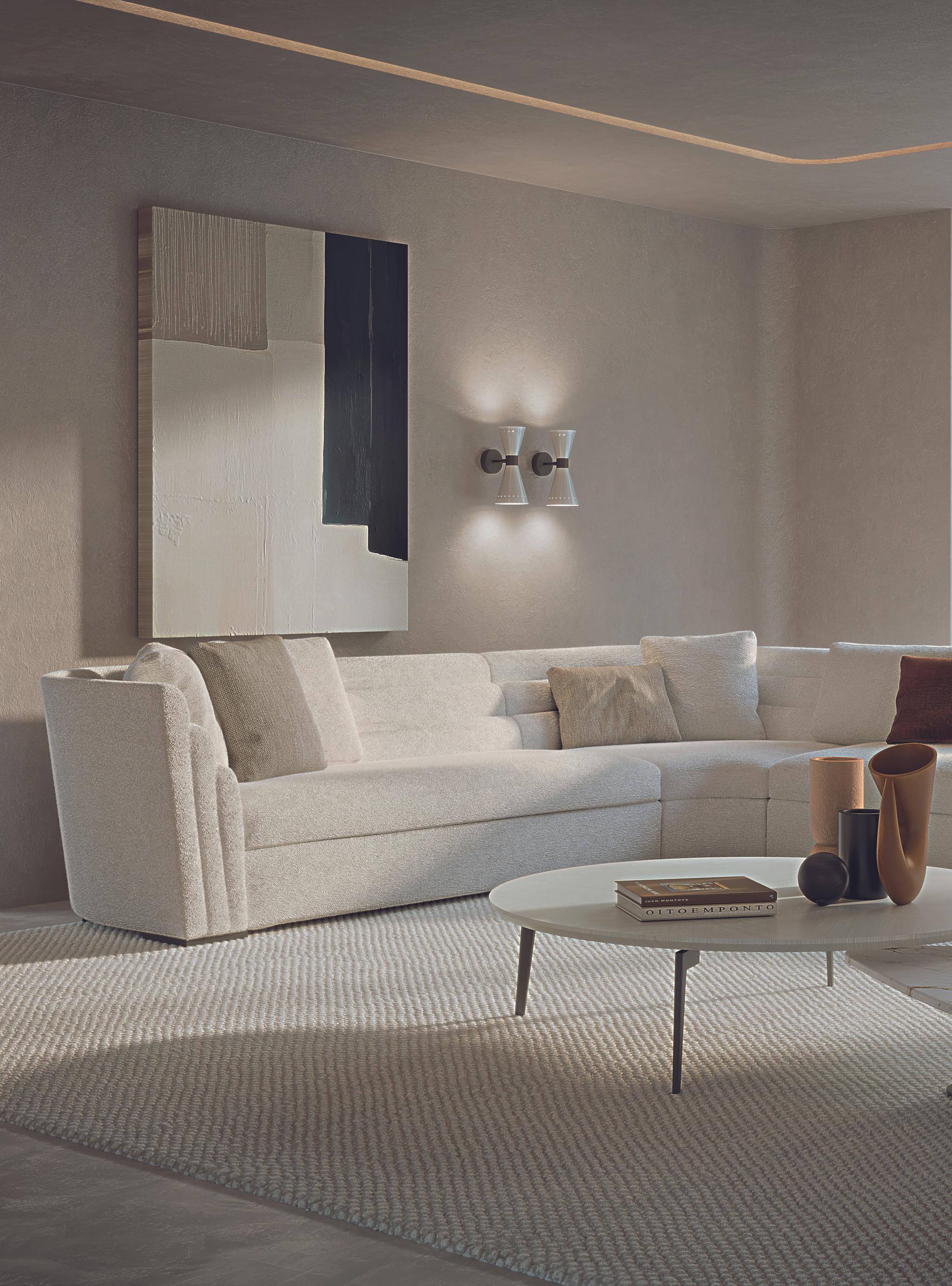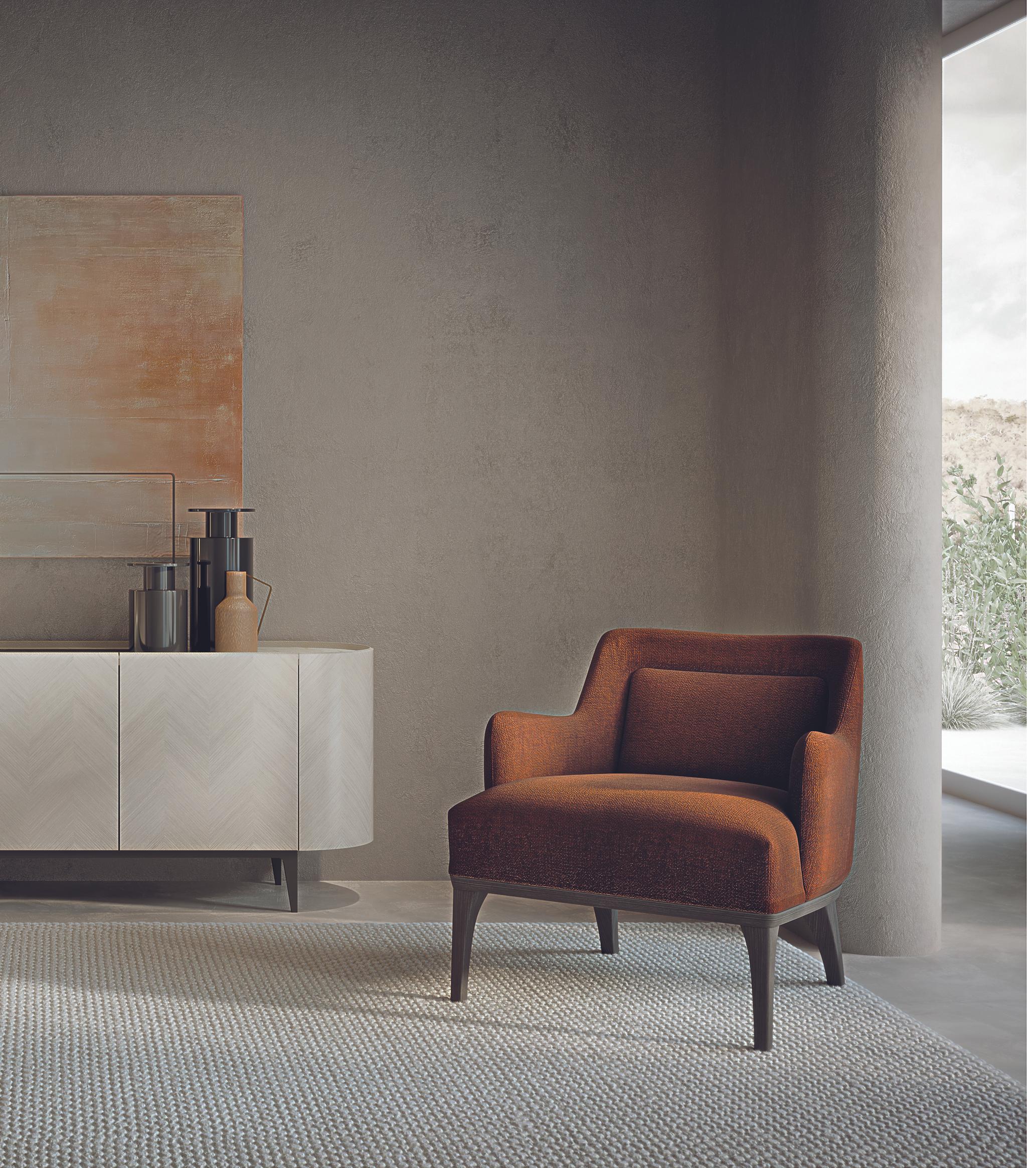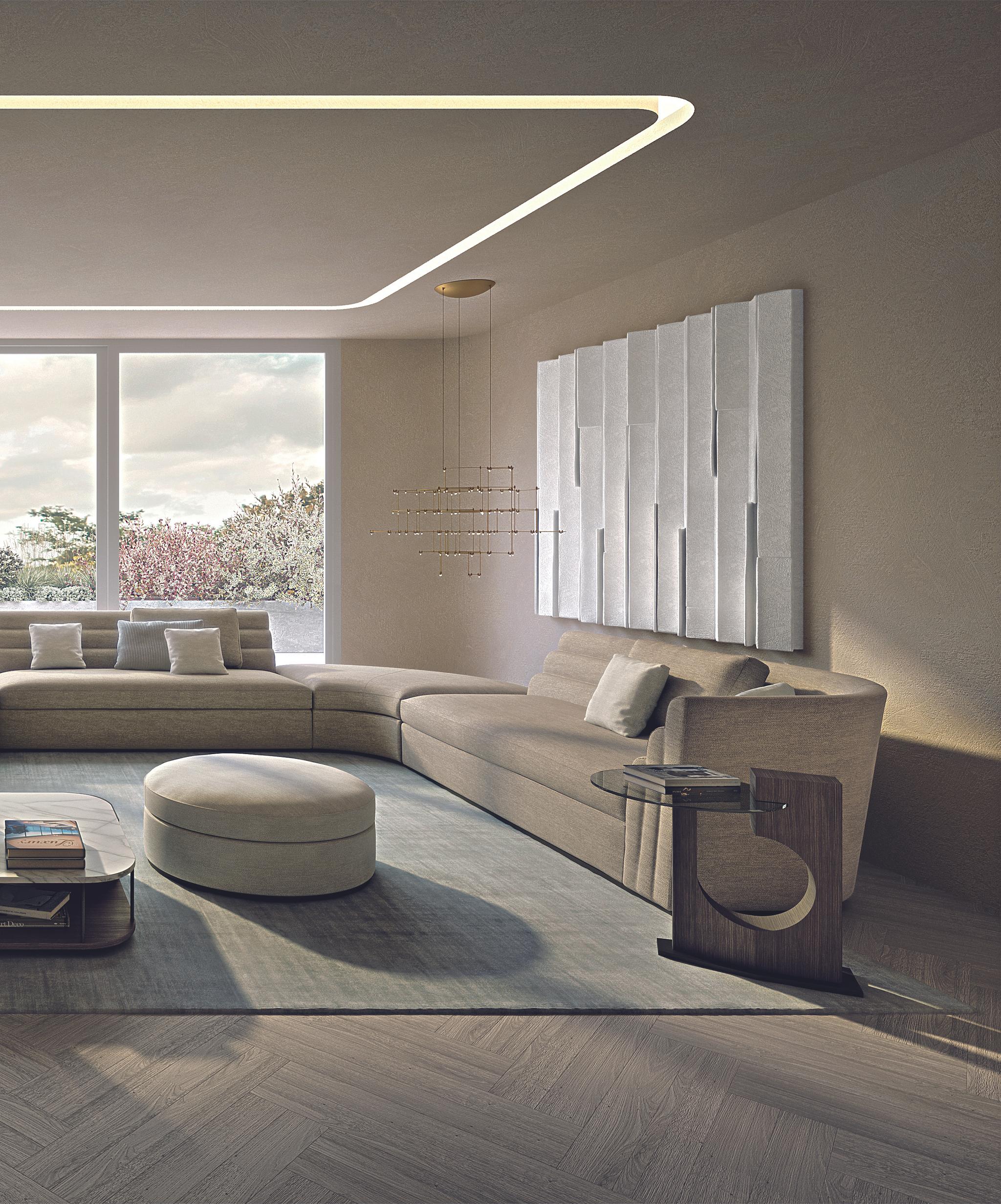 The choice of materials is an elegant chromatic path that crosses the richness of neutral and natural tones where the identity of each color is enhanced by the presence of the others. The materials: woods with customized textures with a “chevron” motif, the preciousness of marble, metals and curved wood shapes that refer to sculptural elements; the durability of the leather details and the softness of the leather which is silky and delicate to the touch. It is a tactile and material exploration from smooth surfaces such as marble to the more irregular ones with natural grain (linen, woods, plasters). And finally a refined visual experience dictated by the refinement of the “hand made” elements and by the effects of the refraction of light. Natural light becomes the undisputed protagonist and the furniture seems to have been chosen and arranged to enhance it.