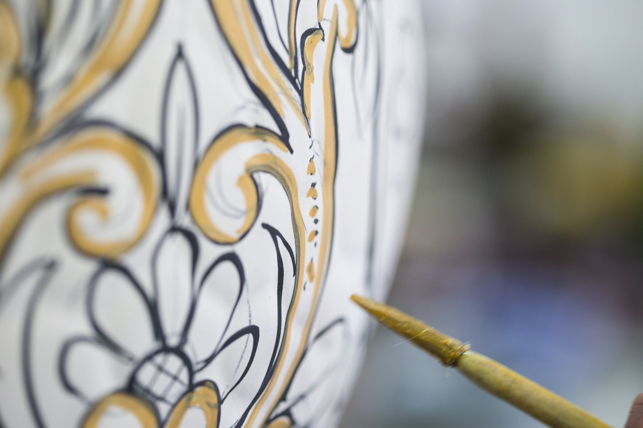 The spolvero, which means "dusting", is used by ceramists to paint patterns by hand. They would outline the design by dusting powdered charcoal through pinpricks made on thin paper with the original pattern to keep uniformity of the design which is always hand-painted to ensure the highest quality.